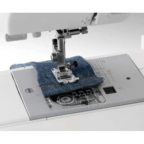 Permite ajustar el ancho de zigzag hasta 7 mm y la longitud de puntada hasta 5 mm, y la doble altura de prensatelas facilita trabajar con géneros más gruesos con mayor comodidad y sin forzar la máquina.