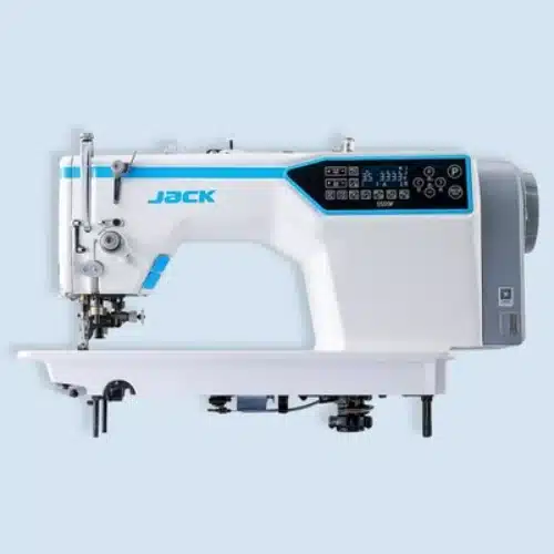 La Jack JK-5559F-W es una recta industrial de 1 aguja con cuchilla refiladora integrada, cabezal semi-seco con barra DLC, velocidad de 4.000 ppm y longitud de puntada de 5 mm. Motor Direct Drive, remates y alzaprensatelas digitales silenciosos, instrucciones habladas y luz LED. Distancia aguja-cuchilla de 1/8″.