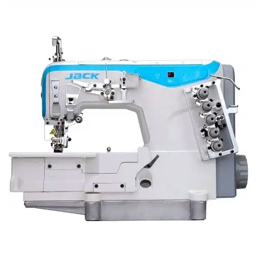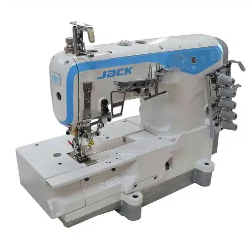 Jack JK-W4D-05X356 — Recubridora industrial de base plana con regulador de puntilla, exclusivo de esta variante dentro de la serie W4-D. 3 agujas, 5 hilos, recubrimiento superior e inferior, motor Direct Drive y hasta 5.500 puntadas/min. Pensada para quien necesita una recubridora especializada, no una máquina de uso genérico.