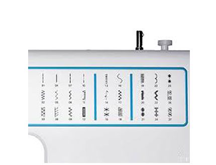 Incluye 27 puntadas orientadas a costura práctica, tejidos elásticos y algunos acabados decorativos, cubriendo las necesidades más habituales en costura doméstica y pequeñas confecciones.